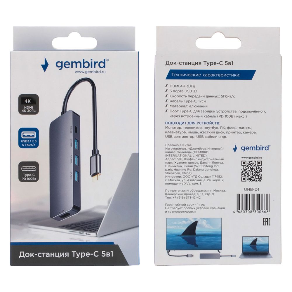 HUB Gembird UHB-D1 5в1, 3xUSB3.1, Type-C PD100W, HDMI, кабель Type C, металл