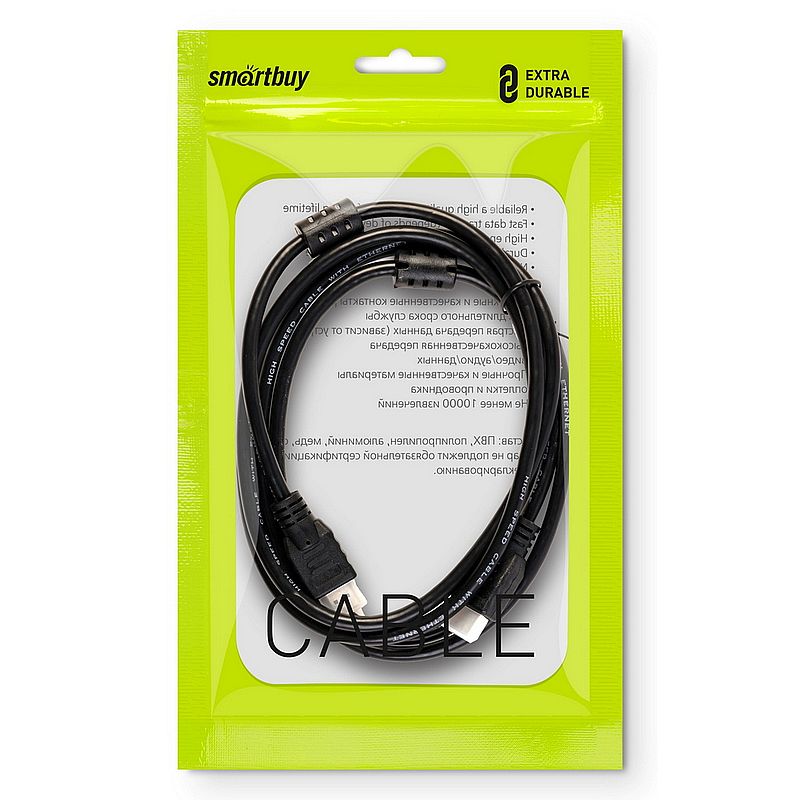 Кабель Smartbuy используется для подключения аудио и видео устройств с интерфейсом HDMI. Он поддерживает технологию реверсивного звукового канала (ARC), сетевой интерфейс Ethernet 100 Мбит/сек (HEC), 3D-изображение и разрешение экрана до 4K. Позолоченные контакты и ферритовые фильтры обеспечивают передачу сигнала без помех.