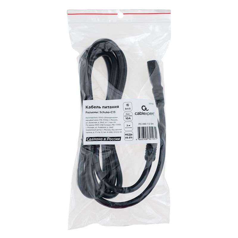 Кабель Cablexpert PC-186 предназначен для подключения компьютерной, офисной техники к сети 220 В. Оснащен разъёмом C13 и вилкой S22. Имеет длину 3 метра и выдерживает нагрузку 2200 Вт. В кабеле используется медный провод сечением 3*1.5 мм2.