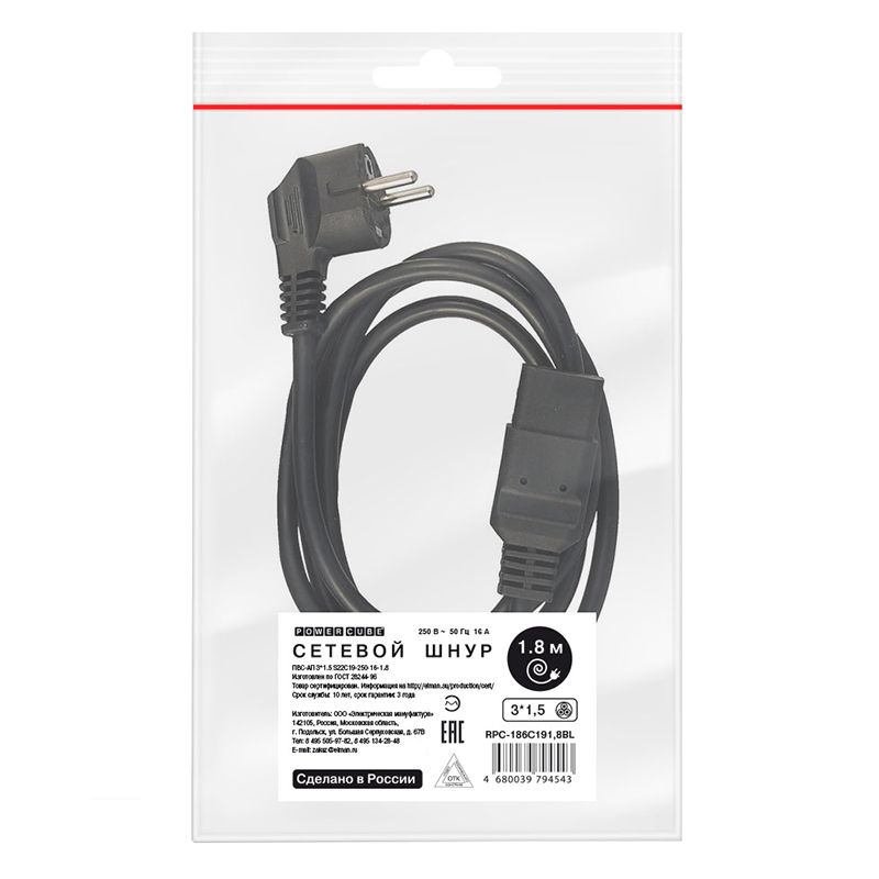 Кабель питания 220В, Schuko- C19, 3x1.5 мм2, 16A, 1.8 м, черный, Power Cube (RPC-186C191,8BL)