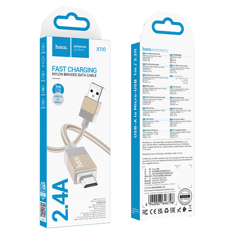 Кабель USB 2.0 - Micro USB, 1 м, 2.4A, золотистый, нейлон, Hoco X110