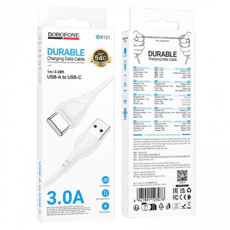 Кабель USB 2.0 - Type C, 1 м, 3A, белый, Borofone BX121