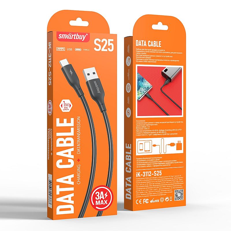 Кабель USB 2.0 - Type C, 1 м, 3A, черный, Smartbuy S25 (iK-3112-S25b)