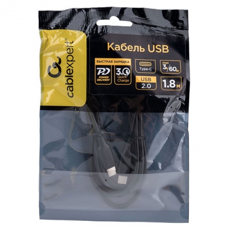 Кабель USB 2.0 Type C M-M - 1.8 м, 60Вт, 3A, PD/QC3.0, черный, Cablexpert (CC-USB2-CMCM-60-1.8M)