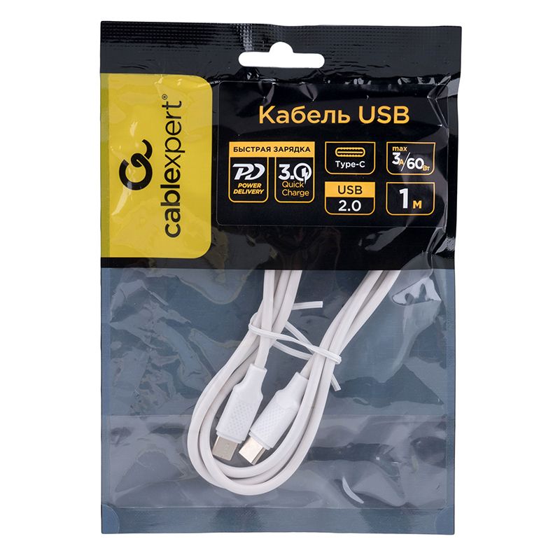 Кабель USB 2.0 Type C M-M - 1 м, 60Вт, 3A, PD/QC3.0, белый, Cablexpert (CC-USB2-CMCM-60-1M-W)