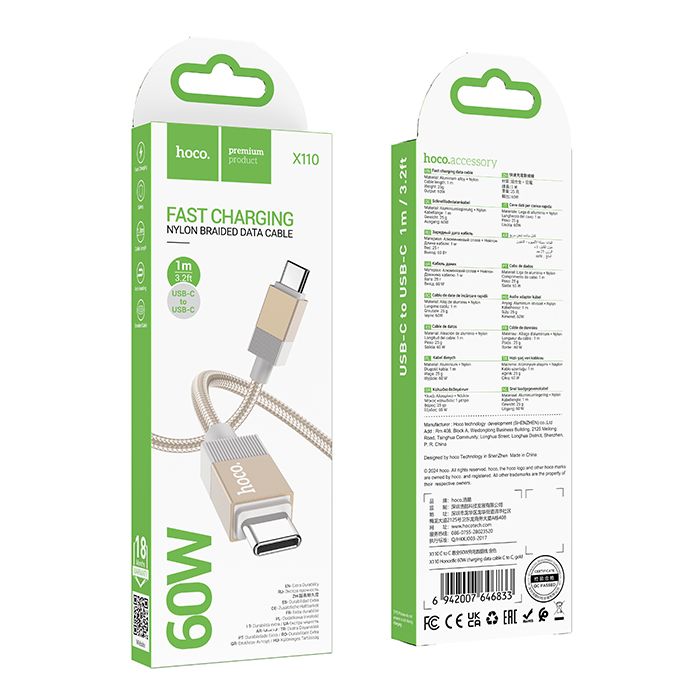 Кабель USB 2.0 Type C M-M - 1 м, 60Вт, 3A, PD/QC3.0, золотистый, нейлон, Hoco X110