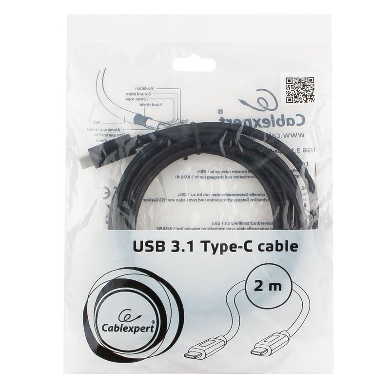 Кабель USB 3.1 Type C M-M, 2 м, PD/QC3.0 36 Вт, черный, Cablexpert (CCP-USB3.1-CMCM-2M)
