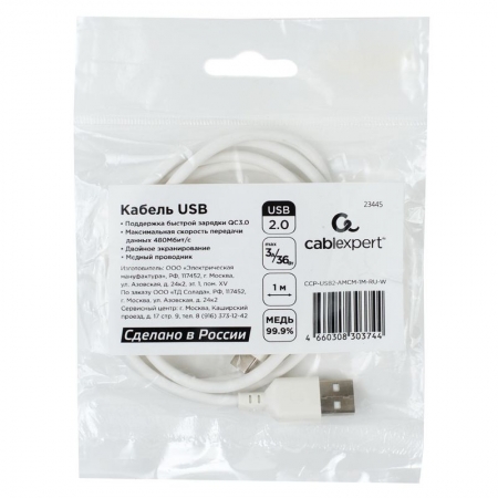Кабель USB 3.1 Type C(m) - USB 2.0 Am - 1 м, QC3.0 36 Вт, белый, Cablexpert (CCP-USB2-AMCM-1M-RU-W)