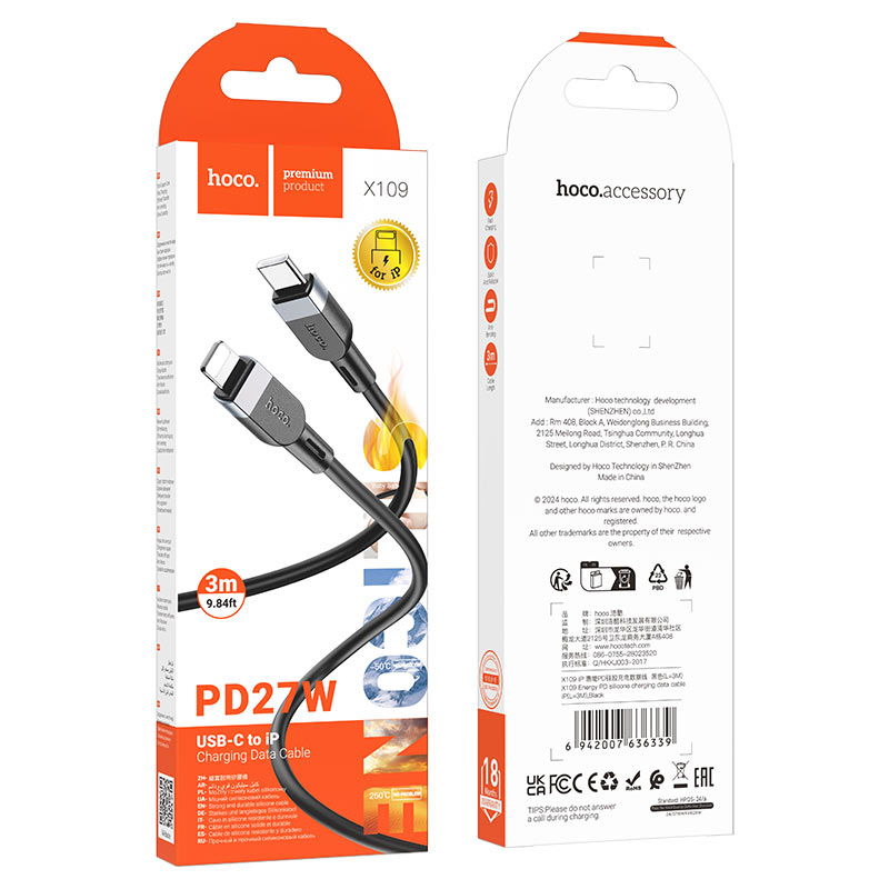 USB-кабель Hoco X109 Energy используется для подключения техники Apple с разъемом Lightning к зарядному устройству или компьютеру, оснащенного разъемом Type C. Подходит для зарядки/передачи данных смартфонов, планшетов и другой портативной техники. Поддерживает протоколы быстрой зарядки PD, максимальная мощность 27 Вт. Оболочка кабеля выполнена из мягкого силикона, устойчивого к экстремальным температурам, коннекторы изготовлены из алюминиевого сплава.