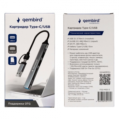 Gembird FD2-MSD-3 - универсальный картридер для карт памяти SD/microSD и USB-концентратор (хаб), который подключается через комбинированный разъем USB Type-A или Type-C. Поддерживает функции OTG (On-The-Go), позволяющая подключать периферийные устройства (например, флэш-накопители, мыши, клавиатуры) к совместимым смартфонам или планшетам.