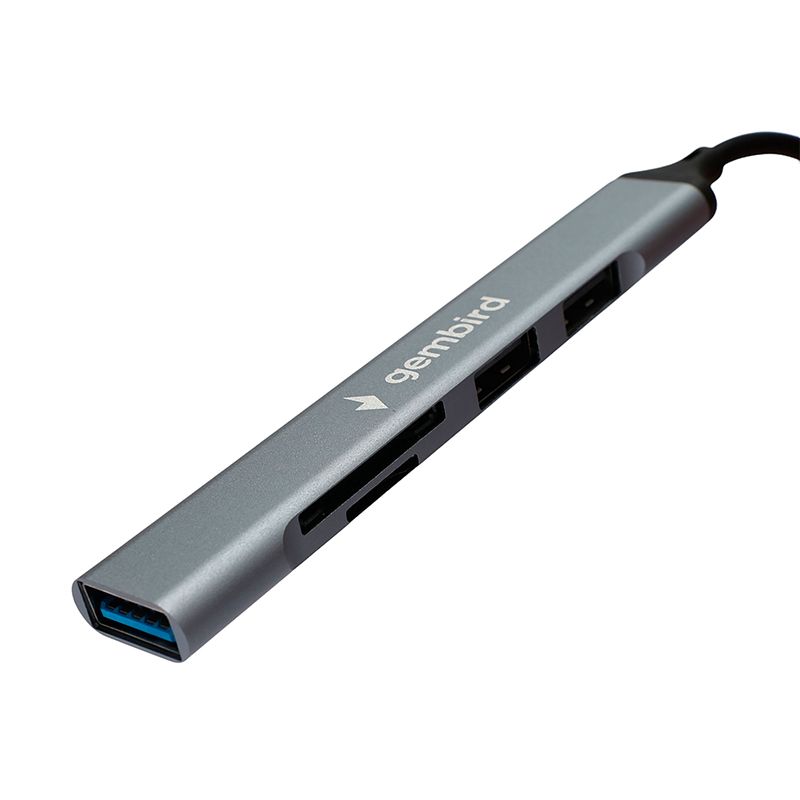 Карт-ридер внешний USB Gembird FD2-MSD-3, SD/microSD, USB3.1, 2xUSB2.0, кабель USB/Type C, металл
