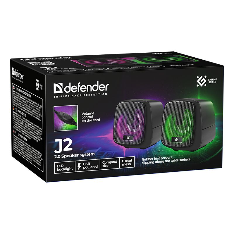 Defender J2 - компактные компьютерные колонки 2.0 со светодиодной подсветкой и питанием от USB. Для управления звуком предусмотрен регулятор громкости, расположенный на кабеле. К источнику звука акустика подключается с помощью стандартного 3.5 мм разъема.