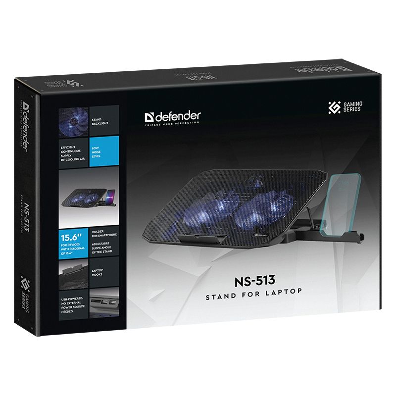 Defender NS-513 - компактная охлаждающая подставка с двумя мощными вентиляторами и регулируемым углом наклона для максимального комфорта при работе с ноутбуком. Фиксаторы для ноутбука обеспечат устойчивое положение техники на подставке.