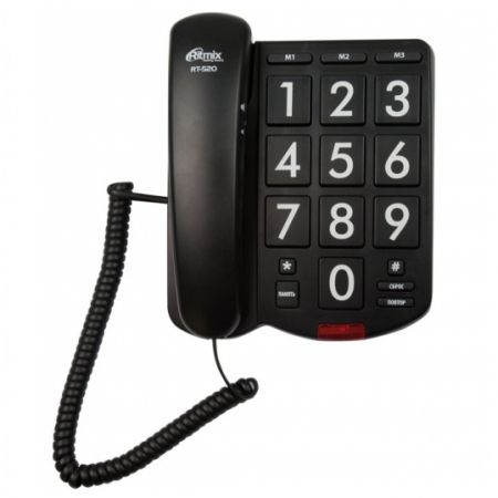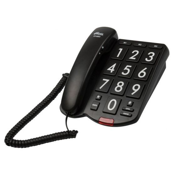 Ritmix RT-520 - проводной телефон с большими кнопками, который идеально подойдет для слабовидящих людей. Световой индикатор звонка и регулировка его громкости помогут не пропустить вызов, а регулировка громкости в трубке будет полезна для тех, кто испытывает трудности со слухом. Три экстренных номера однокнопочного набора без труда сохраняются в память телефона. Телефонный аппарат можно расположить на столе или прикрепить на стену с помощью специальных отверстий, расположенных на задней стенке корпуса.