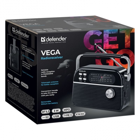 Defender Vega - портативный беспроводной FM/AM/SW радиоприемник с Bluetooth 5.3 и поддержкой флеш накопителей и карт памяти microSD.
