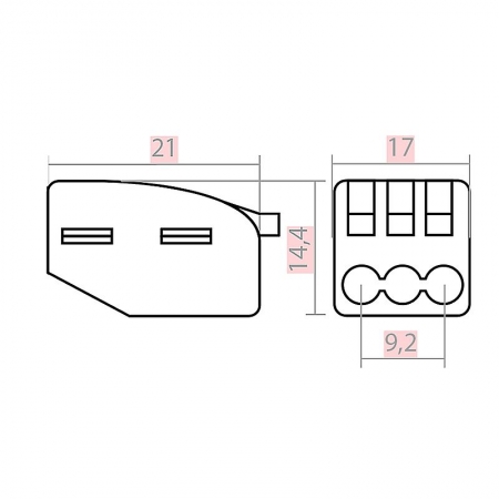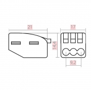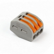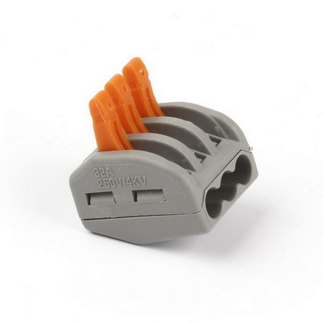 Строительно-монтажная клемма предназначена для соединения трёх проводников сечением 0.5-4 мм2. Пружинный зажим клеммы обеспечивает