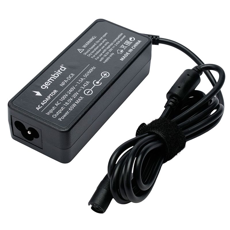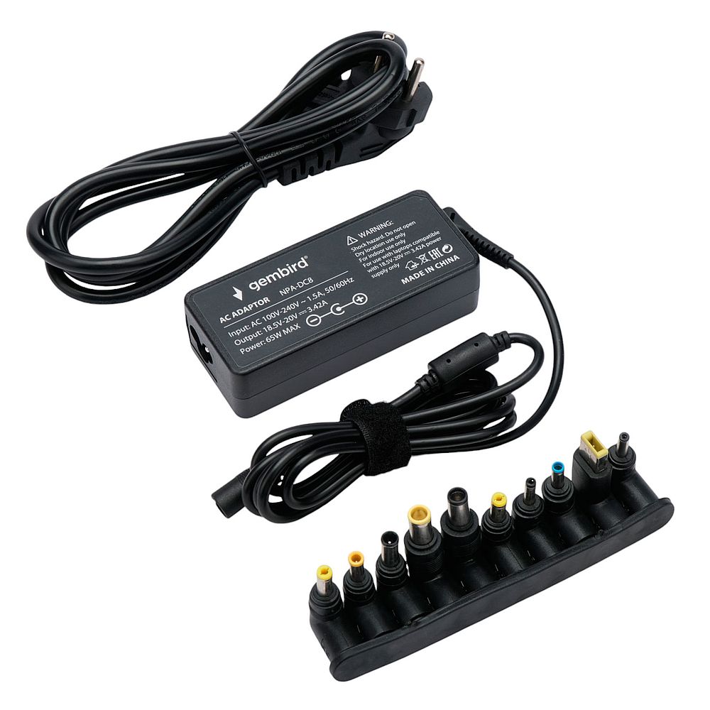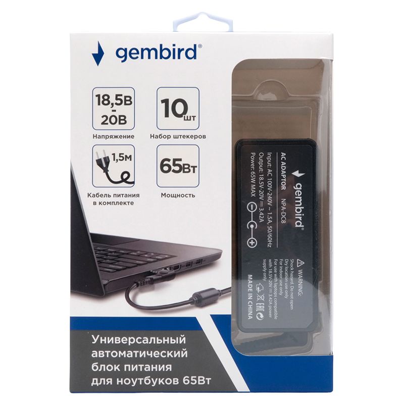 Gembird NPA-DC8 - универсальный автоматический блок питания для ноутбуков. Адаптер обладает мощностью 65 Вт и совместим с большинством моделей ноутбуков, представленных на рынке. Выберите необходимый разъем для вашего ноутбука и адаптер автоматически установит необходимое напряжение. Устройство имеет защиту от перегрузки, перегрева и короткого замыкания. В комплект входят 10 штекеров для совместимости с ноутбуками различных производителей.