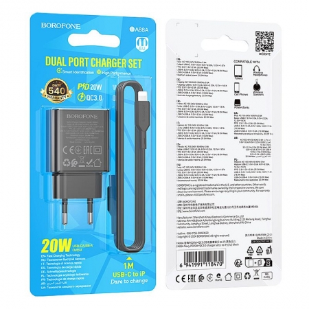 Зарядное устройство Borofone BA88A, QC3.0/PD 20W USB A+C + кабель Type C - Lightning, черное