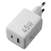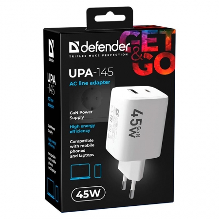 Defender UPA-145 - компактное зарядное устройство мощностью 45 Вт с современной технологией GaN - заряжает быстро, не перегревается и занимает минимум места. Оснащено двумя портами: USB-C и USB-A, подходит для зарядки смартфонов, планшетов, ноутбуков и других гаджетов. Поддерживает быструю зарядку и работает с большинством популярных устройств. Можно подключать сразу два устройства без потери скорости. Универсальный вход 100-240 В - удобно брать с собой в поездки.