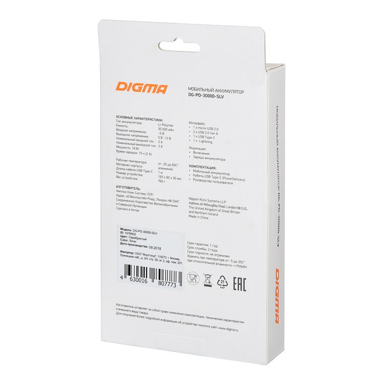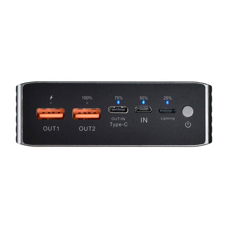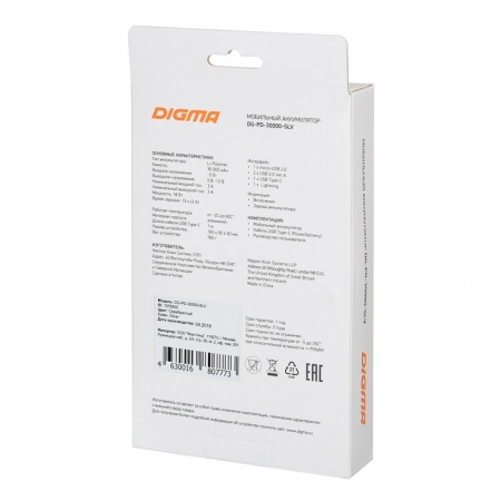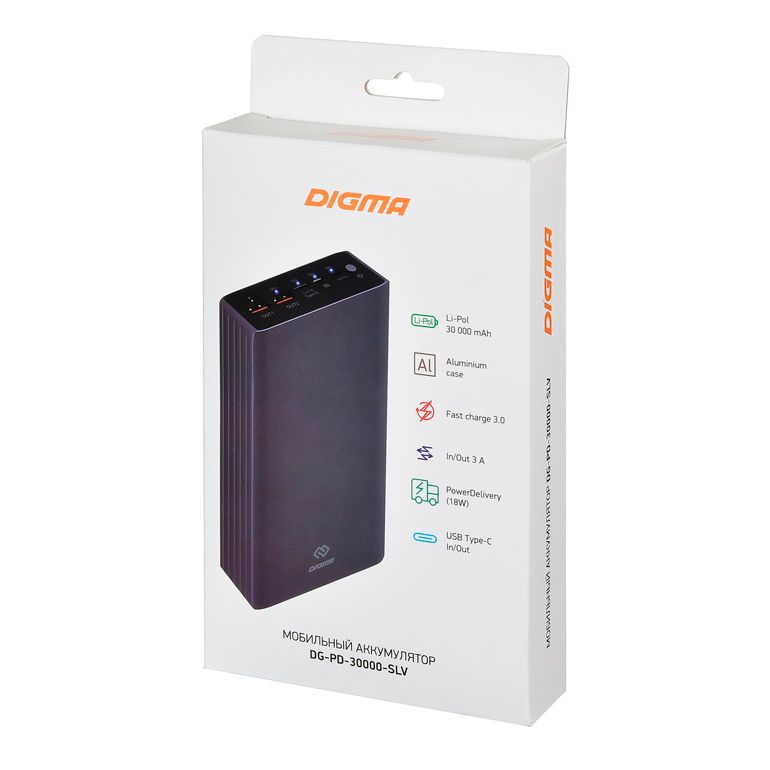 Digma DG-PD-30000-SLV - портативный аккумулятор с поддержкой стандартов быстрой зарядки QC3.0/2.0 и PD (18W). Модель оснащена литий-полимерным аккумулятором емкостью 30000 мАч, двумя выходными портами USB A и портом USB C. Для зарядки повербанка используются входы USB C, Micro USB и Lightning. Контроль за уровнем заряда аккумулятора осуществляется с помощью светодиодного индикатора. Защита от перегрузки, излишнего заряда/разряда и короткого замыкания помогает обезопасить заряжаемое устройство в случае возникновения каких-либо проблем при зарядке. Корпус устройства выполнен из алюминия. В комплект входит кабель USB С.