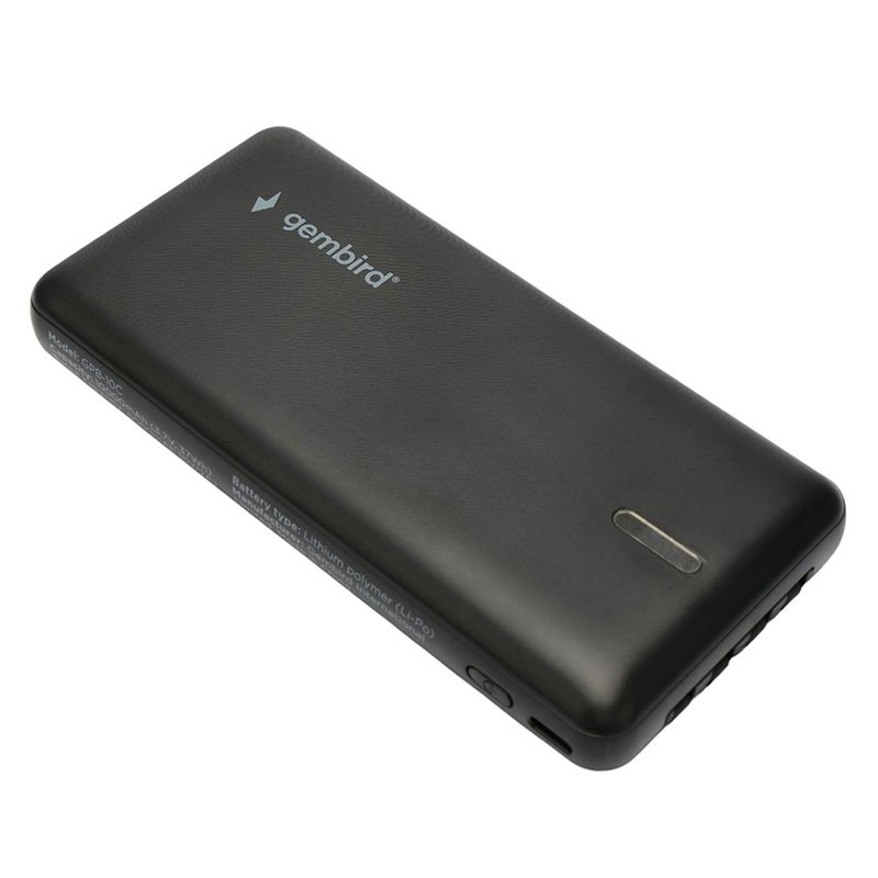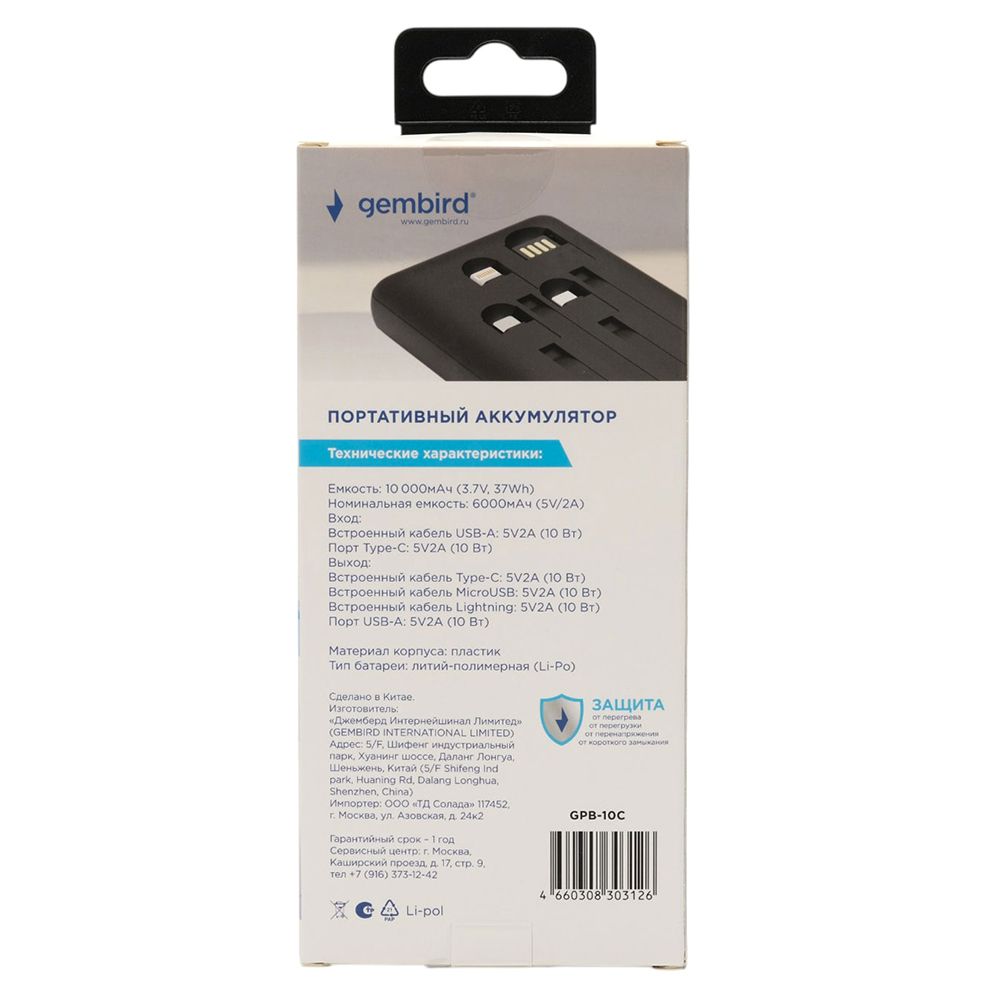 Внешний аккумулятор Gembird GPB-10C обеспечит мобильную технику необходимым резервным питанием во время поездок и путешествий. Устройство оснащено литий-полимерной батареей емкостью 10000 мАч. Наличие встроенных кабелей с разъемами USB-C, Micro USB, Lightning, позволяет зарядить различные мобильные устройства. Контроль за уровнем заряда аккумулятора осуществляется с помощью LED-индикатора. Компактные размеры и небольшой вес делают его удобным для повседневного использования.