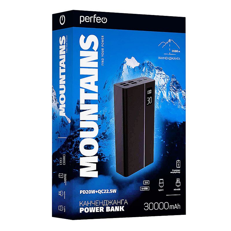 Портативное зарядное устройство Perfeo Mountains - незаменимый помощник, когда нет доступа к источнику питания. Благодаря четырём USB-выходам и выходу Type-C вы сможете заряжать пять устройств одновременно. Выходы Type-C и USB обеспечат быструю зарядку ваших устройств с поддержкой PD и QC3.0. Максимальная мощность на выход 22.5 Вт. Цифровой индикатор всегда подскажет сколько энергии осталось во внешнем аккумуляторе.
