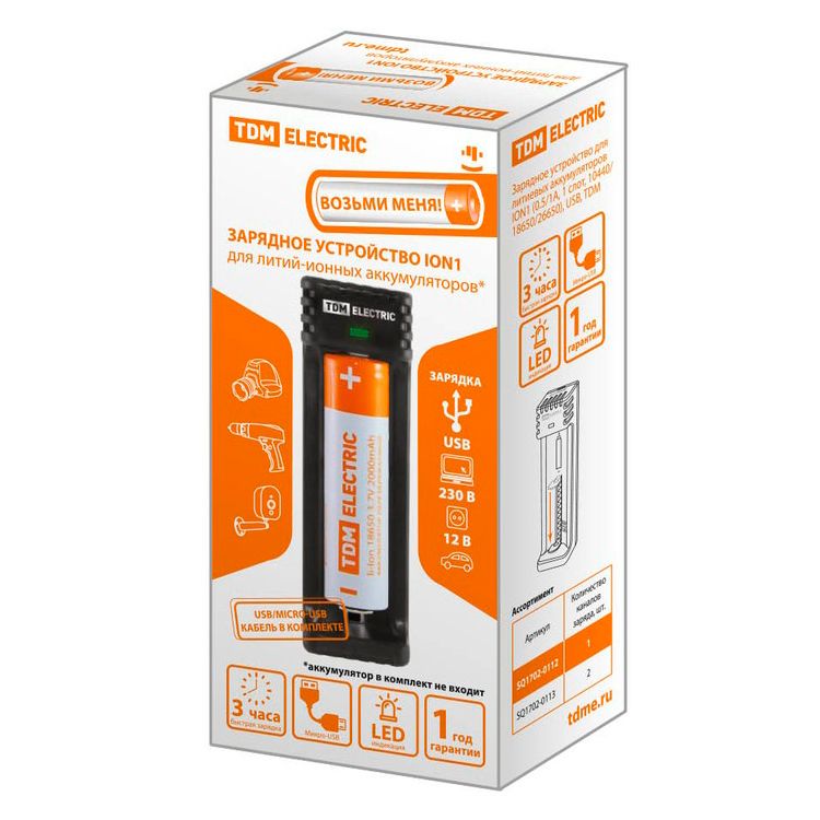 Компактное зарядное устройство TDM ION1 используется для зарядки Li-ion аккумуляторов от USB-порта. Подходит для зарядки 1 аккумулятора типоразмера: 10440, 10500, 12500, 12650, 13450, 13500, 13650, 14500, 14650, 16340/CR123A, 16500, 16650, 17500, 17650, 17670, 18490, 18500, 18650, 18700, 20700, 21700, 22500, 22650, 25500, 26500, 26650. В комплект входит кабель USB для питания зарядного